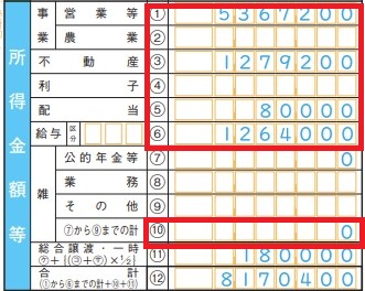 下記の場合だと第一表の①事業所得5,367,200+③不動産所得1,279,200+④利子所得0円+⑤配当所得80,000+⑥給与所得1,264,000+⑩雑所得0=8,008,400円