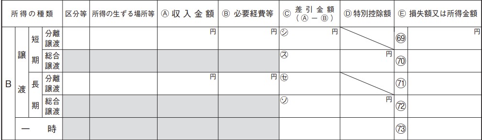 Bの「譲渡(70)、(72)」欄、「一時(73)」欄については総合課税なので、確定申告書第二表の総合課税の譲渡所得、一時所得に関する事項をみながら作成します。