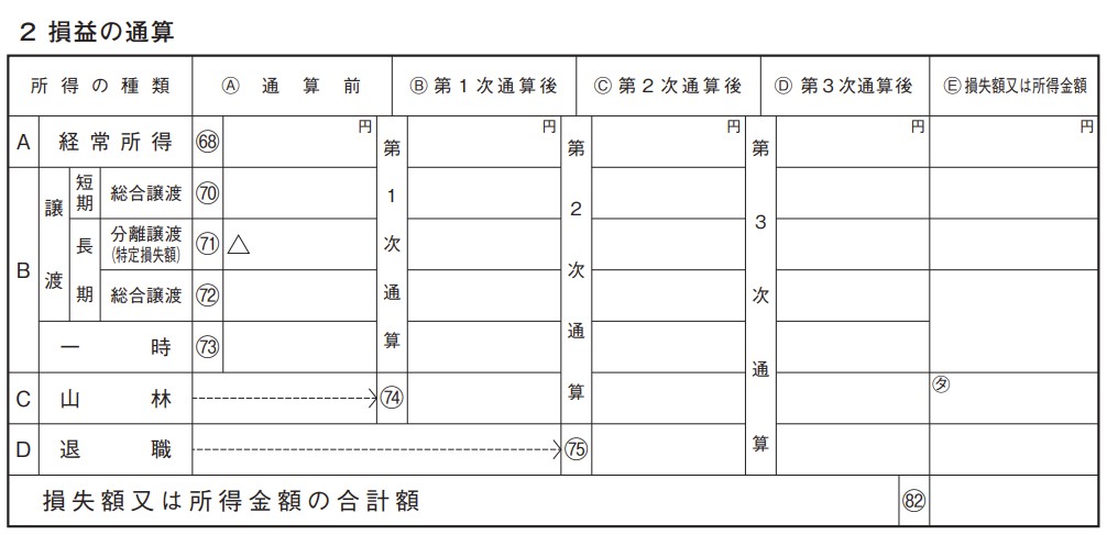 | E | 確定申告書 第四表の「損益の通算」の(74)欄の金額(黒字のときは0) |