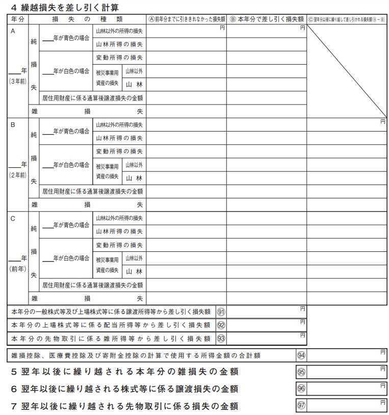 「繰越損失を差し引く計算」には、前年から繰り越した損失の金額と、確定申告をする年分から差し引く損失、翌年に繰り越す損失の金額を記入します。