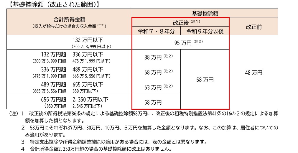 これまで基礎控除は一律48万円でしたが、2025年からは合計所得金額に応じて、58万円〜95万円の範囲で段階的に控除されることになります。
