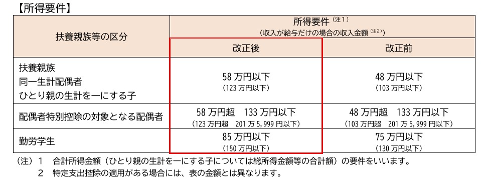扶養親族等の所得要件の変更