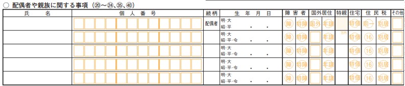 配偶者控除や配偶者特別控除、障害者控除、特定親族特別控除など、控除の対象になる親族がいる場合に記入する欄です。