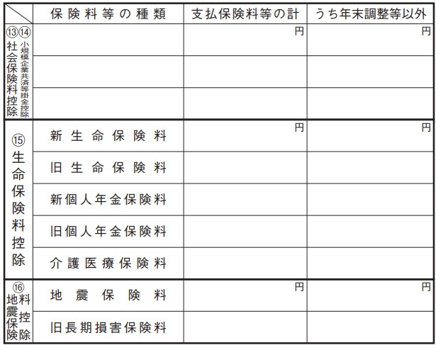 | 生命保険料控除 | ・新生命保険料 ・旧生命保険料 ・新個人年金保険料 ・旧個人年金保険料 ・介護医療保険料 |