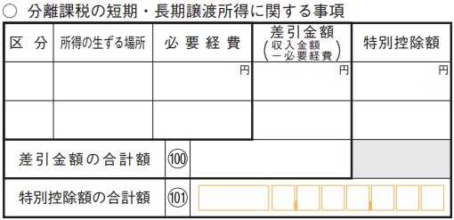 「分離課税の短期・長期譲渡所得に関する事項」には、以下の項目を記入します。