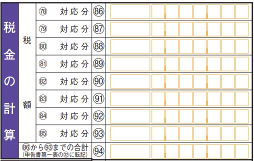 「(86)から(93)までの合計(94)」には、「(78) 対応分(86)」から「(85) 対応分(93)」の税額の合計を記入して、確定申告書 第一表の㉜に転記します。