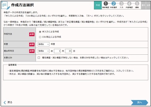 ここまで完了しましたら、いよいよeLTAXでの償却資産申告書の作成段階に入ります。