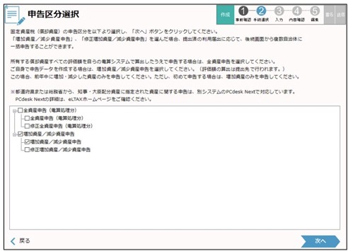 申告区分選択では、「増加資産/減少資産申告」にチェックをいれましょう。