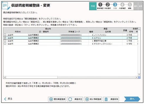 ⑤ 「償却資産明細登録・変更」画面で申告対象となる、複数提出先の償却資産の明細情報をまとめて入力します。