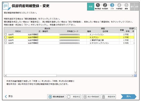 資産明細の登録、修正、削除が完了したら、「次へ」をクリックします。