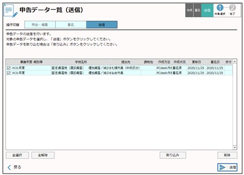 1) 送信したい申告データを選択して、「送信」をクリックします。