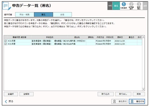申告データに電子署名を付与します。「申告データ一覧(署名)」画面に、署名付与