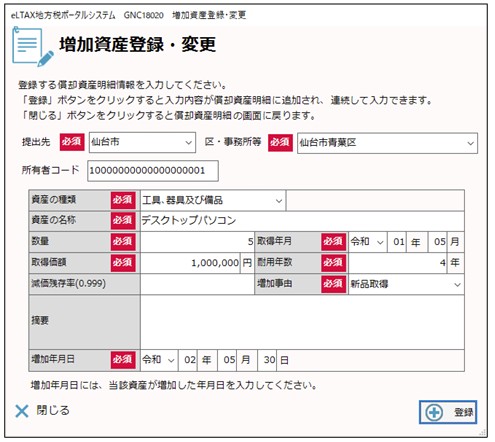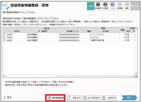 すると「増加資産登録・変更」画面が表示されます。