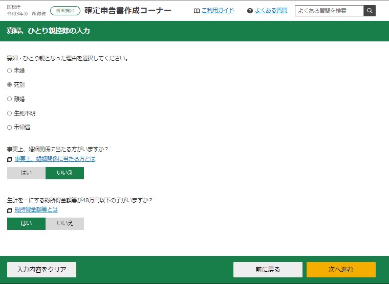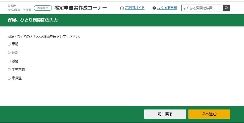 ⑤質問の答えに応じて、「寡婦控除」or「ひとり親控除」or「適用なし」を自動判定してくれます。