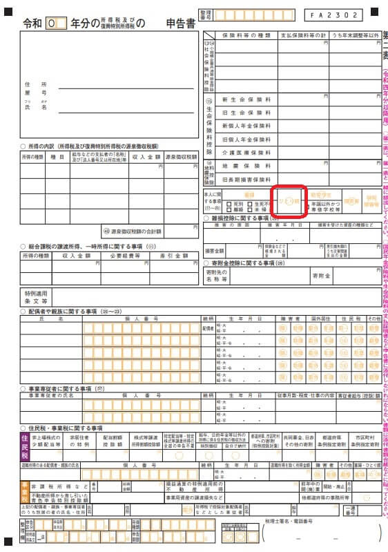 ②第二表については「本人に関する事項」欄の「ひとり親」に〇をつければOKです。