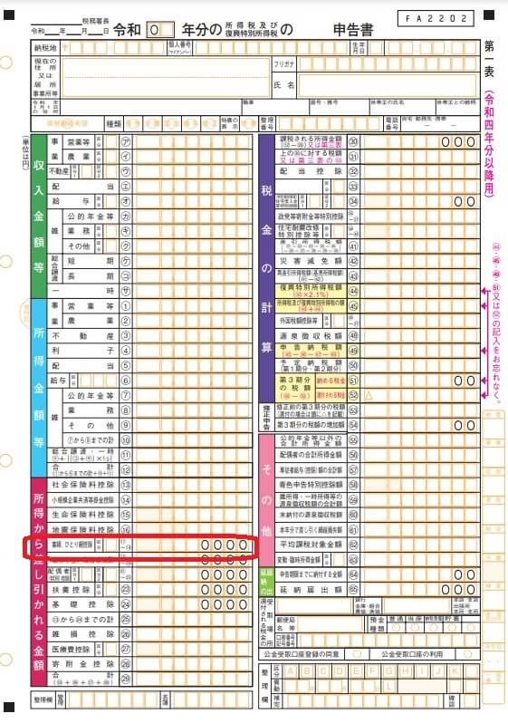①第一表の「寡婦、ひとり親控除」の欄に控除額を記入します。