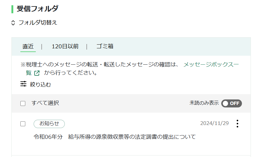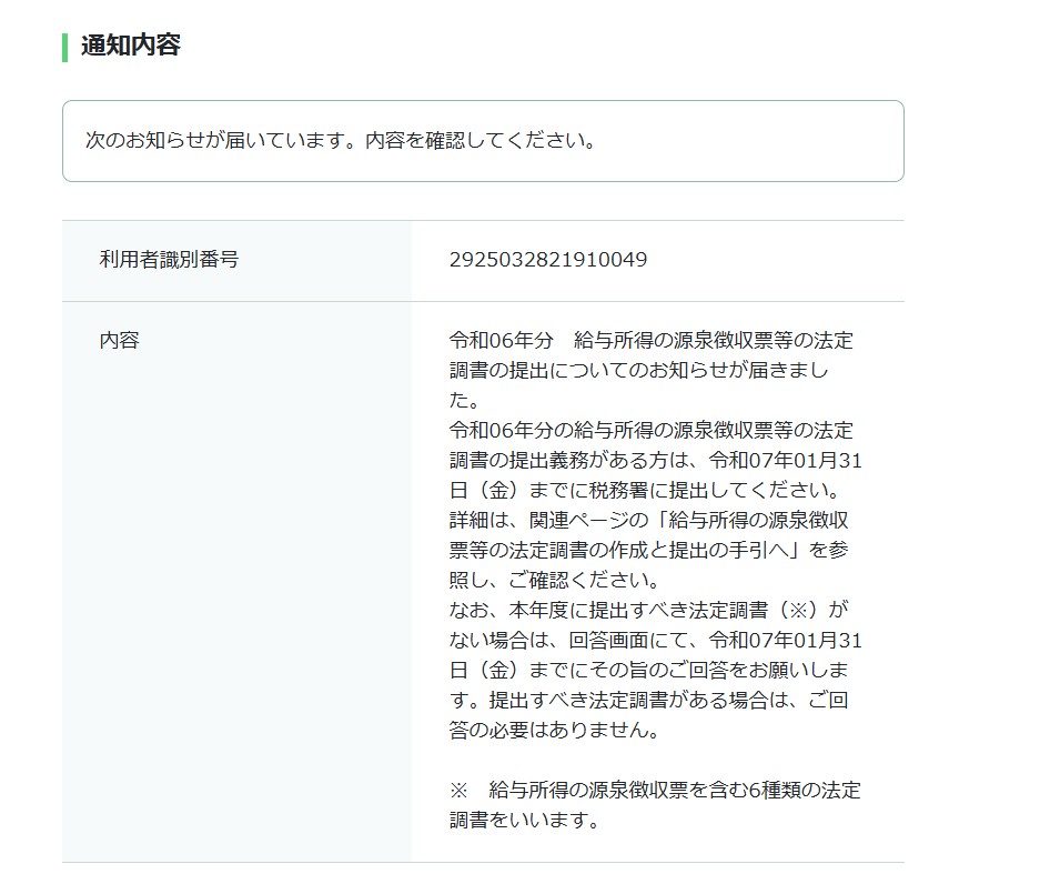 「e-Tax」のメッセージボックスに下記のような「法定調書提出期限のお知らせ」が届きます。