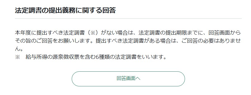 本文の下までスクロールすると「法定調書の提出義務に関する回答」の欄があるので、『回答画面へ』ボタンを押してください。