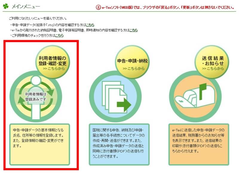 e-taxを登録した時と利用者情報が変更になった場合には「利用者情報の確認・変更」から変更してください。