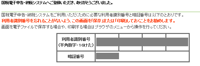 手続き完了後には「利用者識別番号」と自分で設定した暗証番号が表示されますので、必ず印刷またはメモをして保存しましょう。