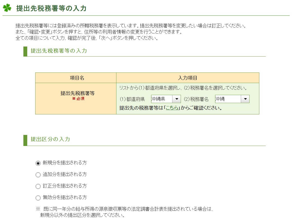 提出先税務署の入力には自動的に都道府県と税務署名が選択されています。
