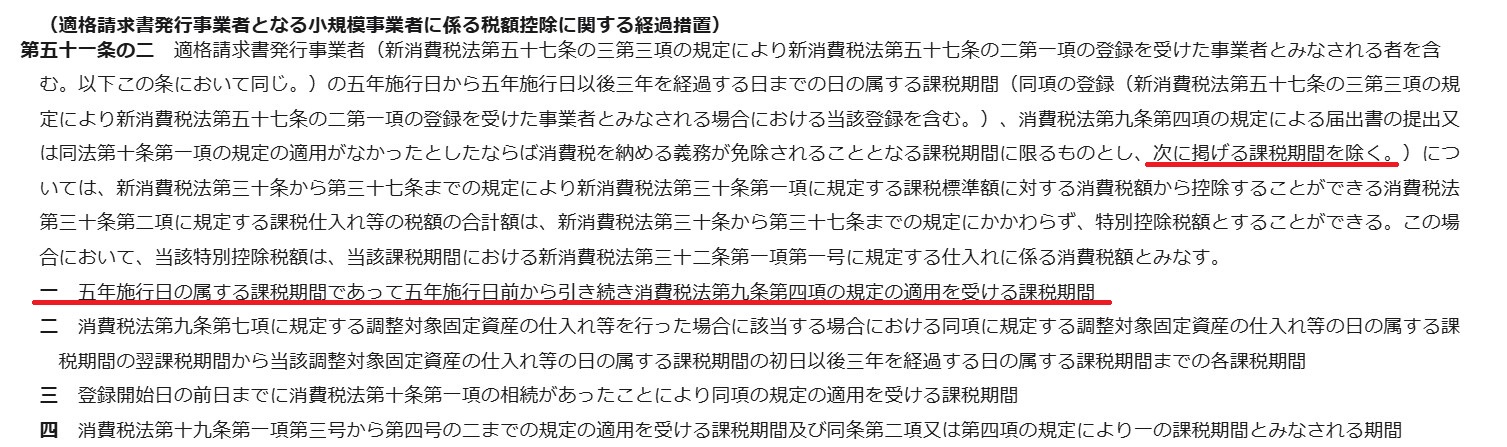 消費税法の平成28年改正法附則の第51条の2第1項第1号が「五年施行日(2023年10月1日)を含む課税期間」に限定しているからです。