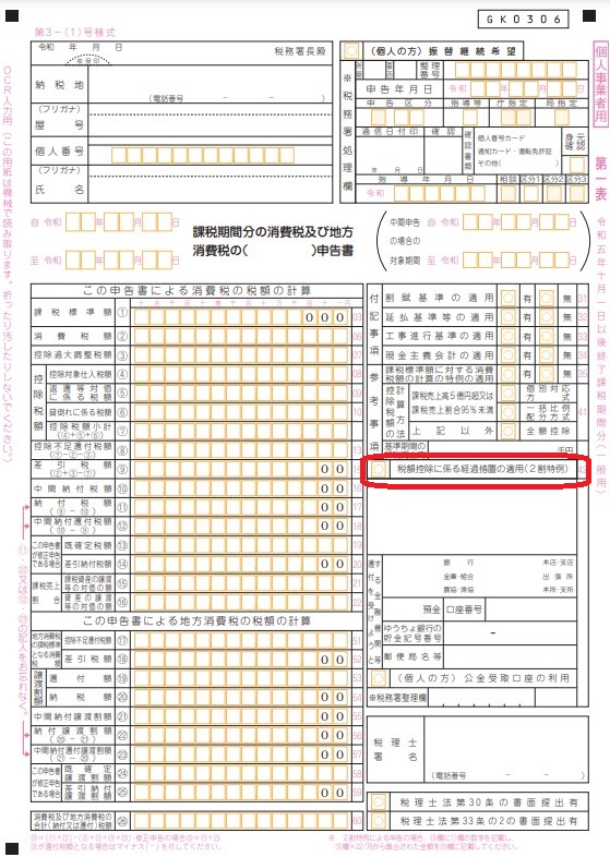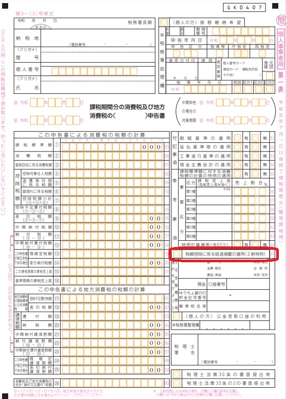 申告書の第一表の右側にある「税額控除に係る経過措置の適用(2割特例)」という欄に〇(マル)をすれば適用できます。