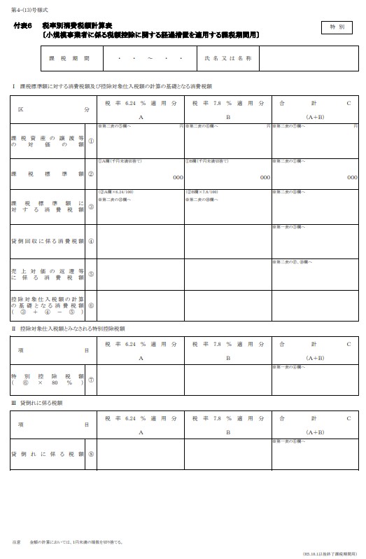 (引用元:税率別消費税額計算表〔小規模事業者に係る税額控除に関する経過措置を適用する課税期間用©国税庁