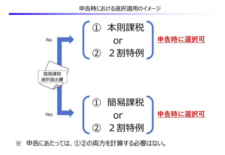 申告の都度「一般課税か2割特例か」「簡易課税か2割特例か」と選択できます。