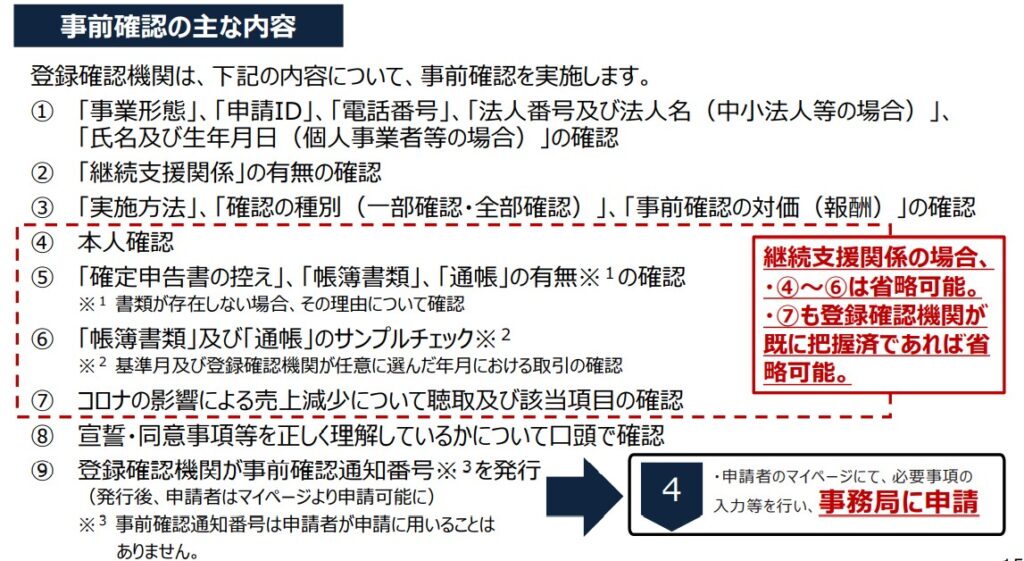 申請前に登録確認機関から「事業を実施しているか」、「新型コロナウイルス感染症の影響を受けているか」、「給付対象等を正しく理解しているか」などの事前確認を受けることが目的になります。