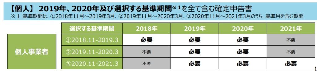 2019年(度)、2020年(度)(※1)及び選択する基準期間(※2)を全て含む確定申告書が必要です。