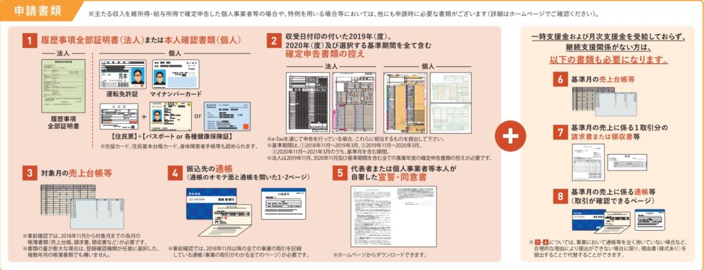 (※1)上記は主な書類であり、特例を用いる場合など、別途必要書類がある場合があります。また、審査時に給付要件を満たさないおそれがある場合には、他の書類(例えば、事業を行っていることが分かる書類や、新型コロナウイルス感染症影響の裏付けとなる書類など)の提出も求める可能性があります。