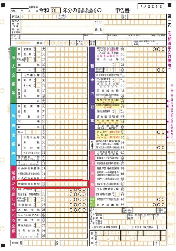 まず第一表「⑯地震保険料控除」の欄地震保険料控除証明書に記載されている控除額を記載します。