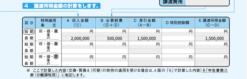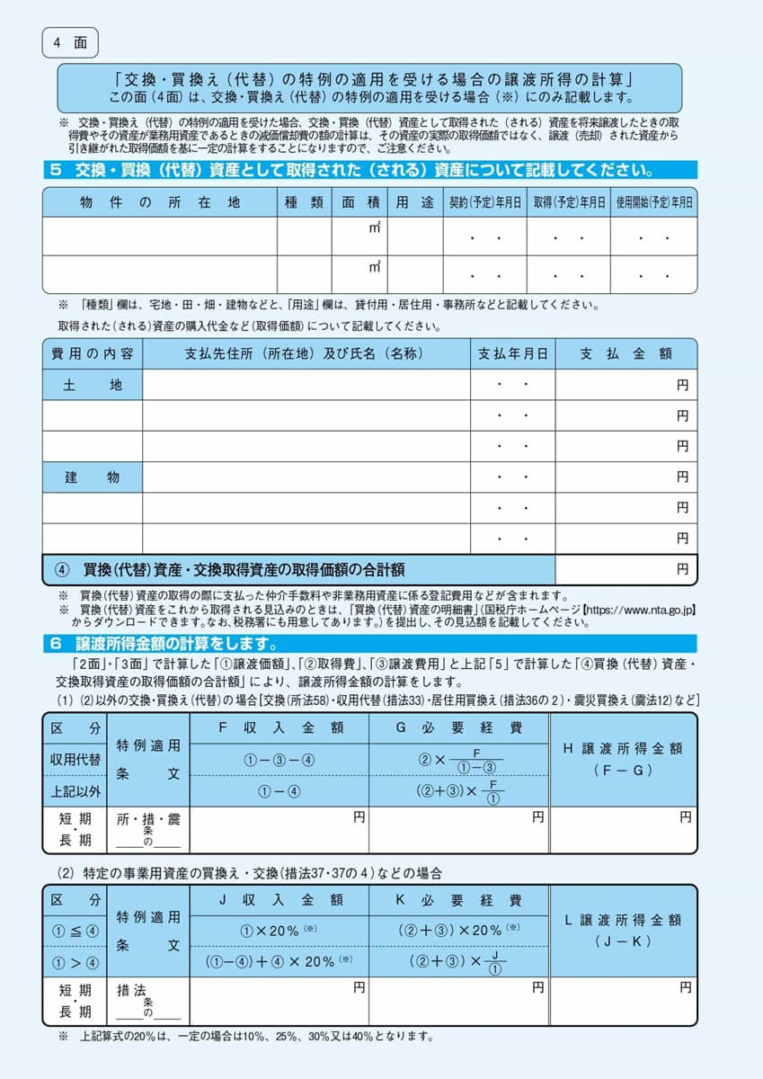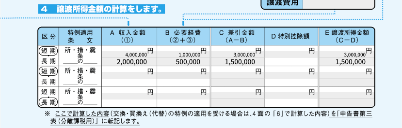 ※ 複数の土地・建物を譲渡した場合について、1組目(初葉)の3面「4譲渡所得金額の計算をします。」欄には、下段に初葉で入力した金額が反映され、中段に次葉を含めた合計額が反映されます。なお、2組目(次葉)がない場合は、下段と中段には同じ金額が反映されます。