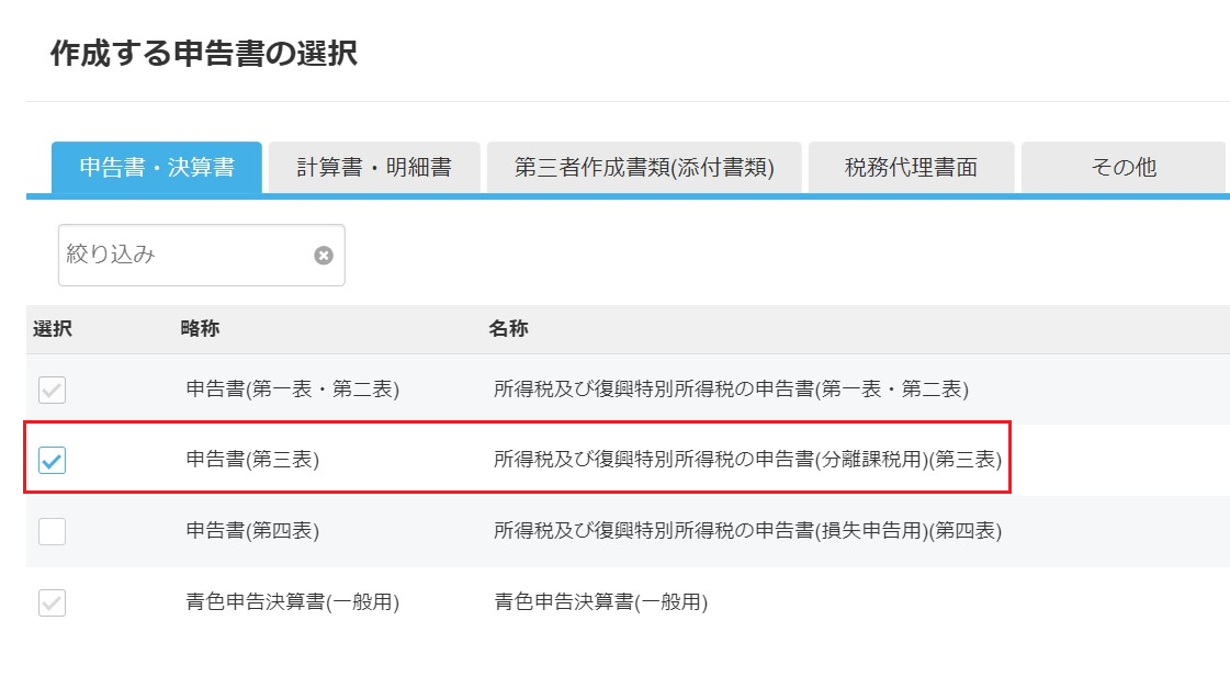 不動産の売却益は申告分離課税であるため、総合課税用の確定申告書とは別に「申告分離課税の申告書(確定申告書第三表 分離課税用)」を作成します。