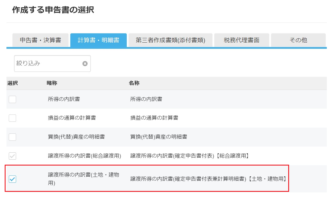 下記のように必要な確定申告書第一表、第二表、第三表、譲渡所得の内訳書までを作成することが可能です。