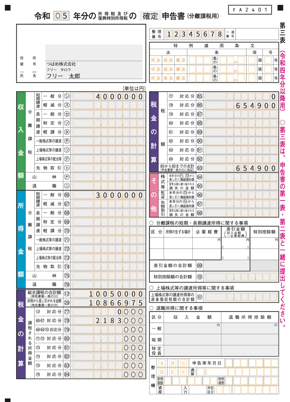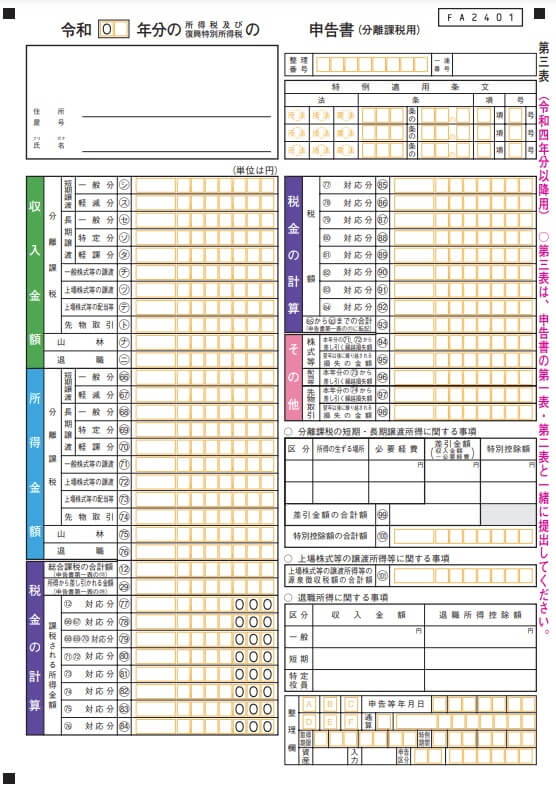 申告分離課税の申告書(申告書第三表 分離課税用)