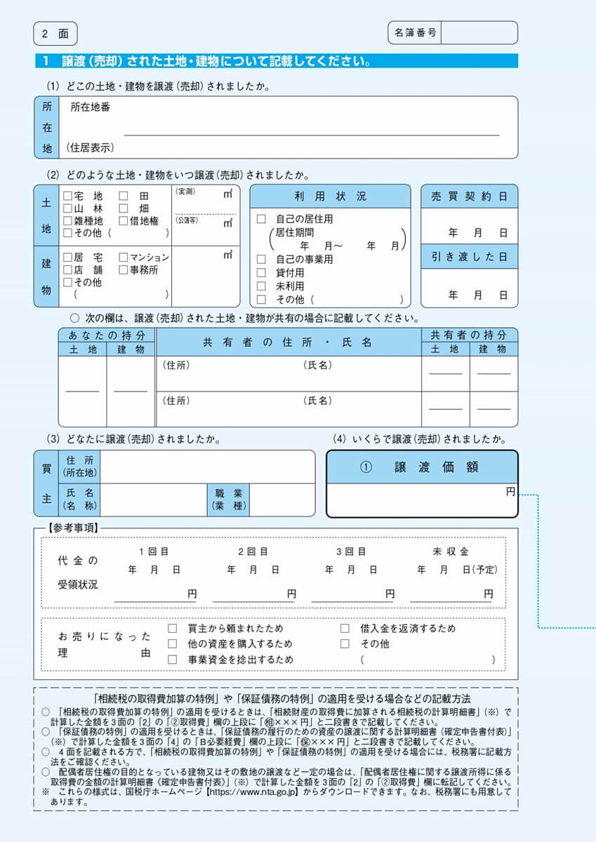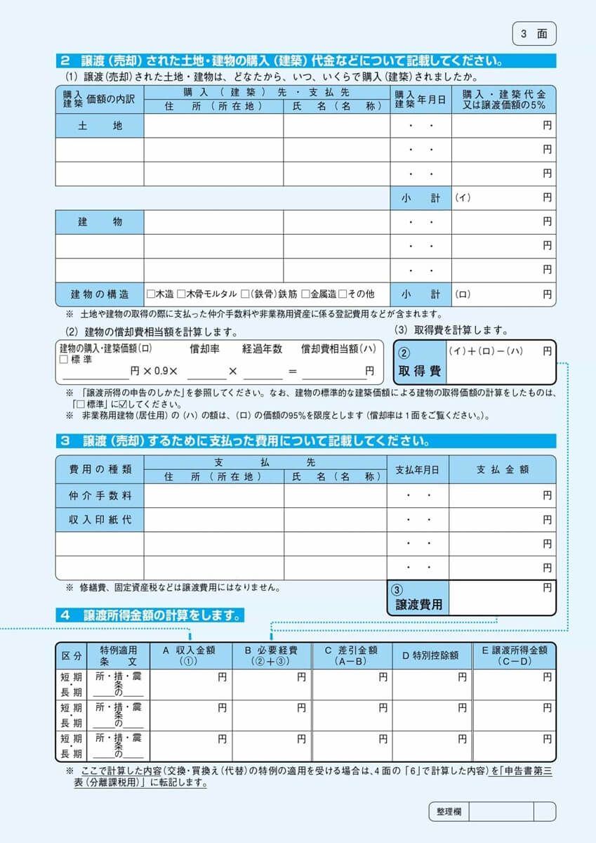 売却した不動産の所在地や面積、売却金額、費用などを記入する書類です。