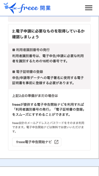 「利用者識別番号の発行」および「電子証明書の登録」を行います。準備がまだの場合は「 freee電子申告開始ナビ 」を利用すると準備をスムーズに進めることができます。