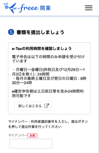 4. 「⑤ 書類を提出しましょう」項目にて、e-Taxの利用可能時間内であることを確認し、電子申請を行います。