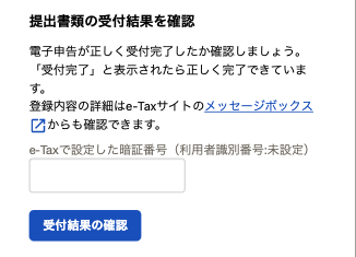 「e-Taxで設定した暗証番号」を入力し[受付結果の確認]ボタンをタップしてください。