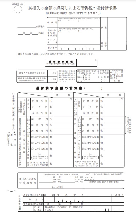 純損失の繰戻還付を受けるためには「純損失の金額の繰戻しによる所得税の還付請求書」の提出が必要です。