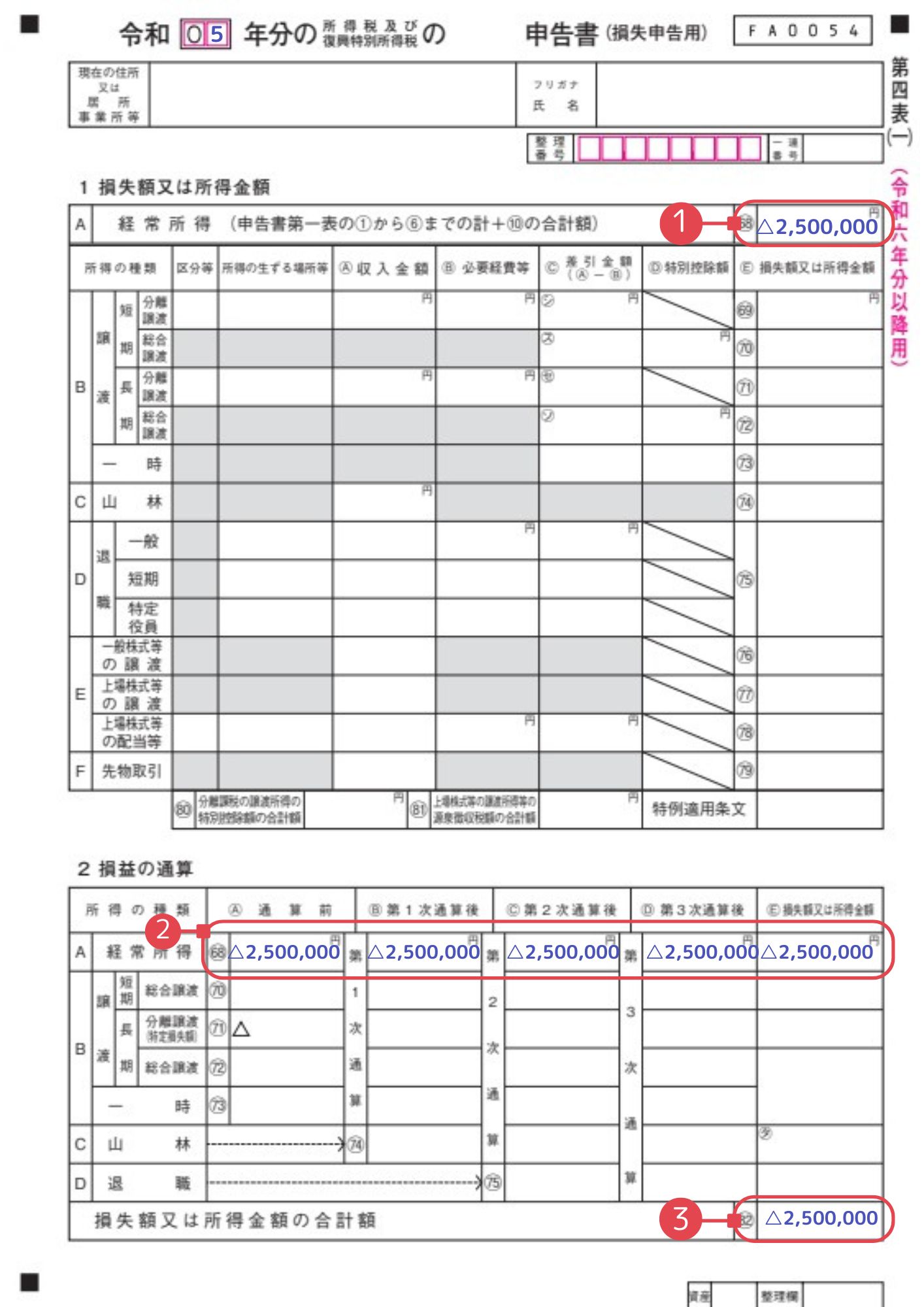 1. 第四表(一)①②に本年度の損失金額△250万円をそのまま記載します。この場合は損益通算なしなので、②にはすべて同じ数字が入ります。