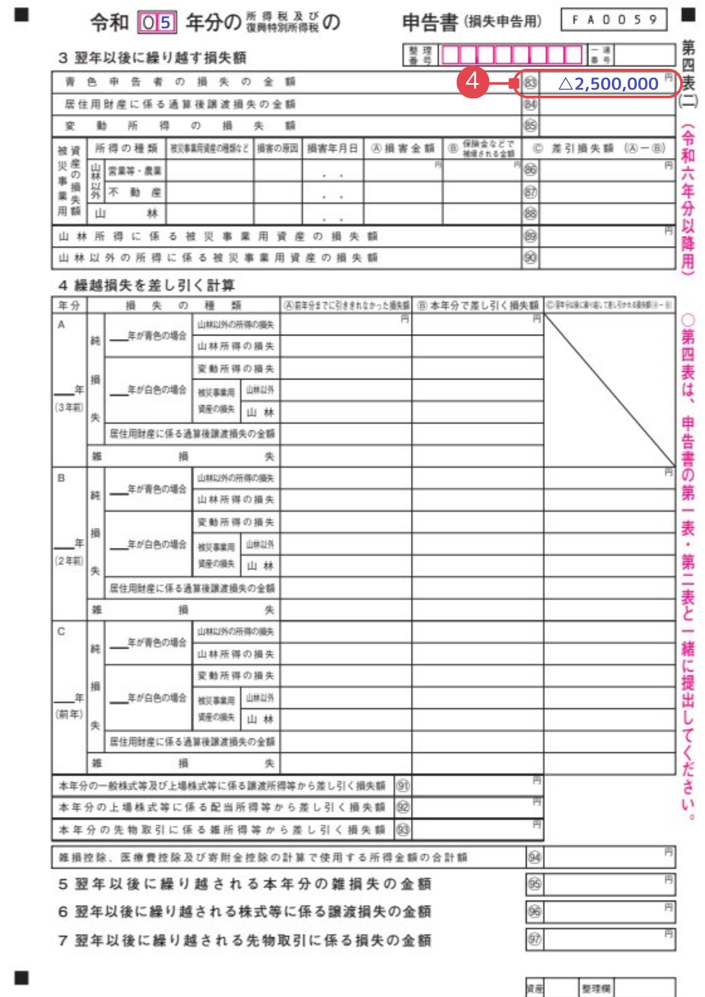 3. 先ほどの③の金額△250万円を第四表(二)の④に記載します。