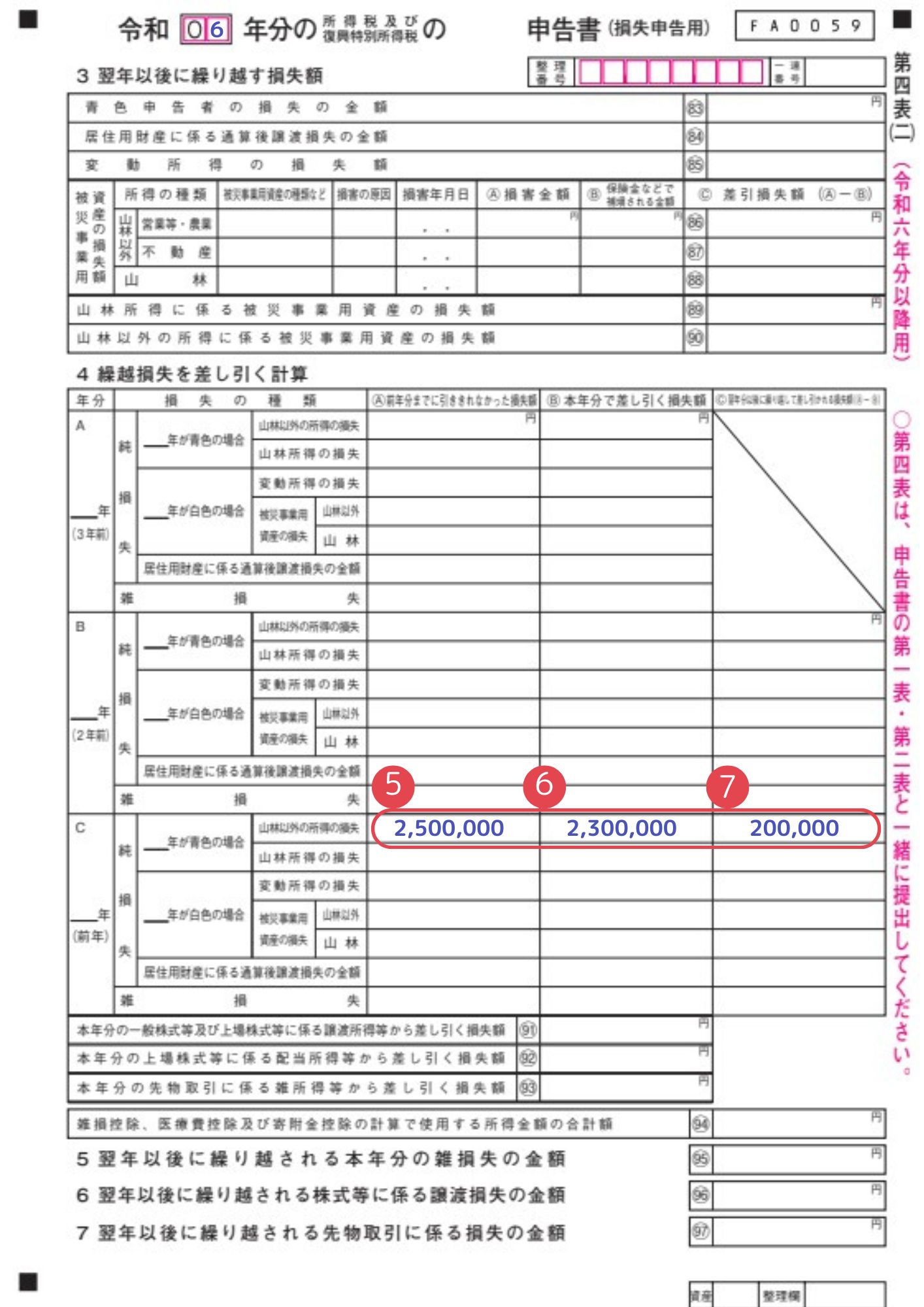 3. ⑤から⑥を引き、翌年分以降に繰り越す損失がある場合は⑦に記載します。