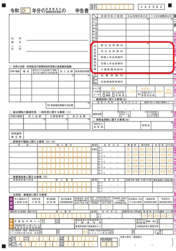 確定申告書の用紙を用いて、まず第二表に、新旧の別に各保険ごとの支払保険料額を記載する必要がありますので、忘れないように記載してください!