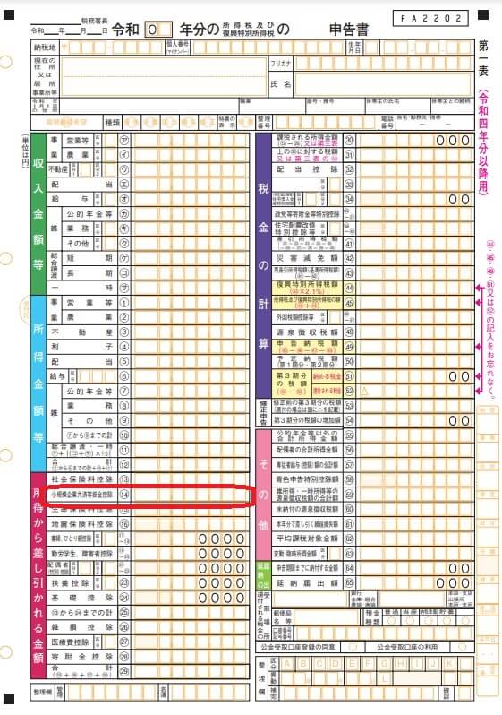 確定申告書の「小規模企業共済等掛金控除」欄に掛け金の合計額を記入してください。第一表の左下と第二表の右上にそれぞれ記入欄があります。
